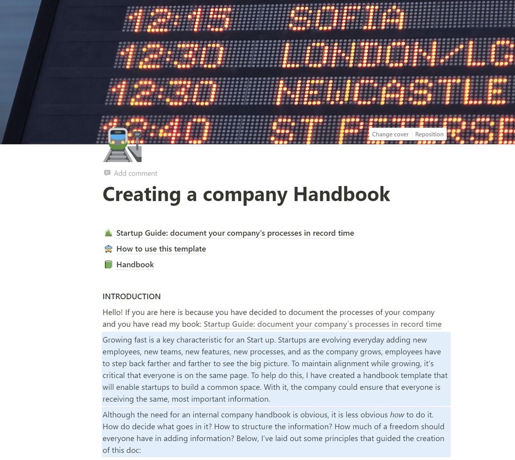 Growing fast is a key characteristic for an Start up. Startups are evolving everyday adding new employees, new teams, new features, new processes, and as the company grows, employees have to step back farther and farther to see the big picture. To maintain alignment while growing, it’s critical that everyone is on the same page. To help do this, I have created a handbook template that will enable startups to build a common space. With it, the company could ensure that everyone is receiving the same, most important information.